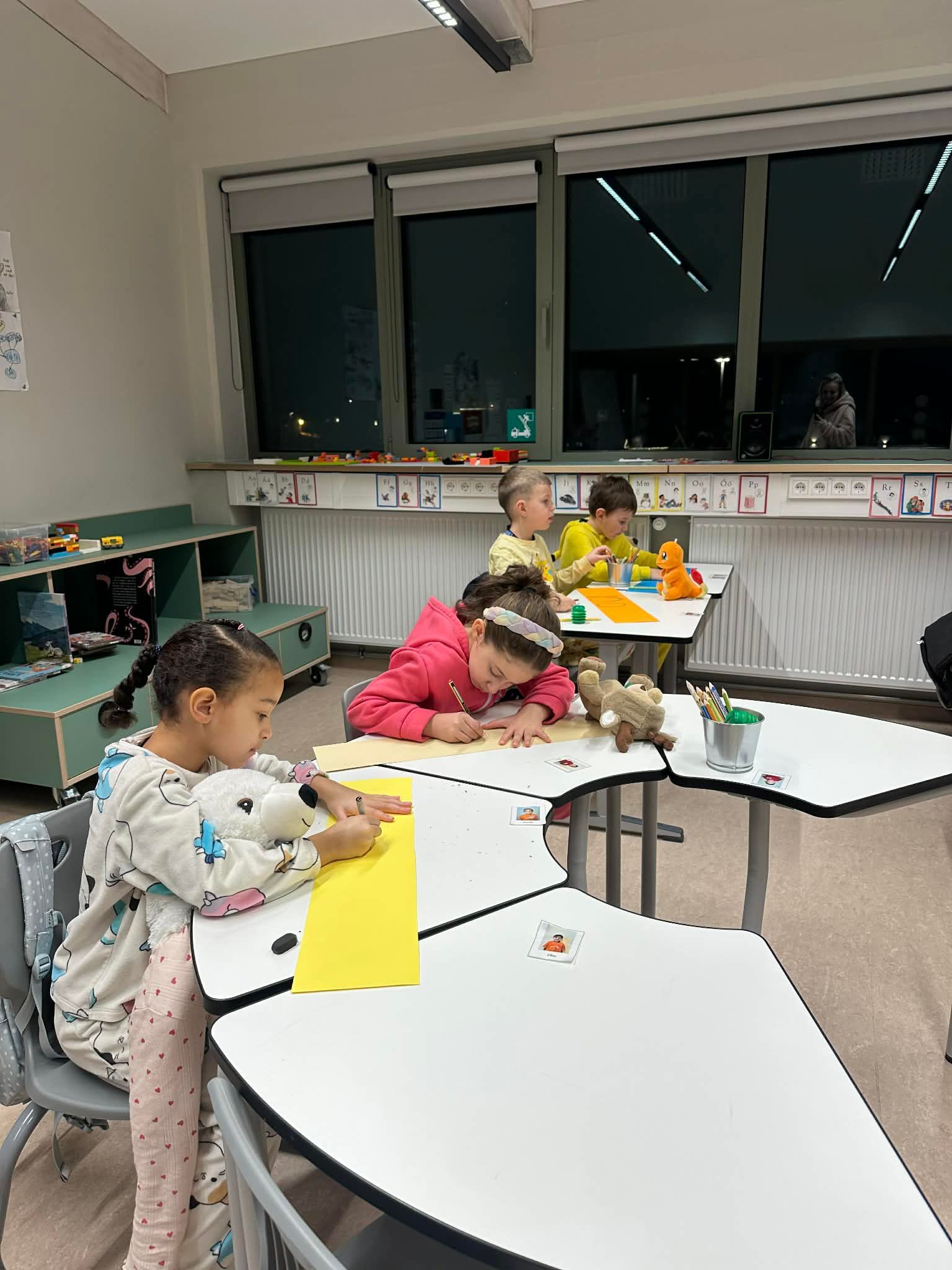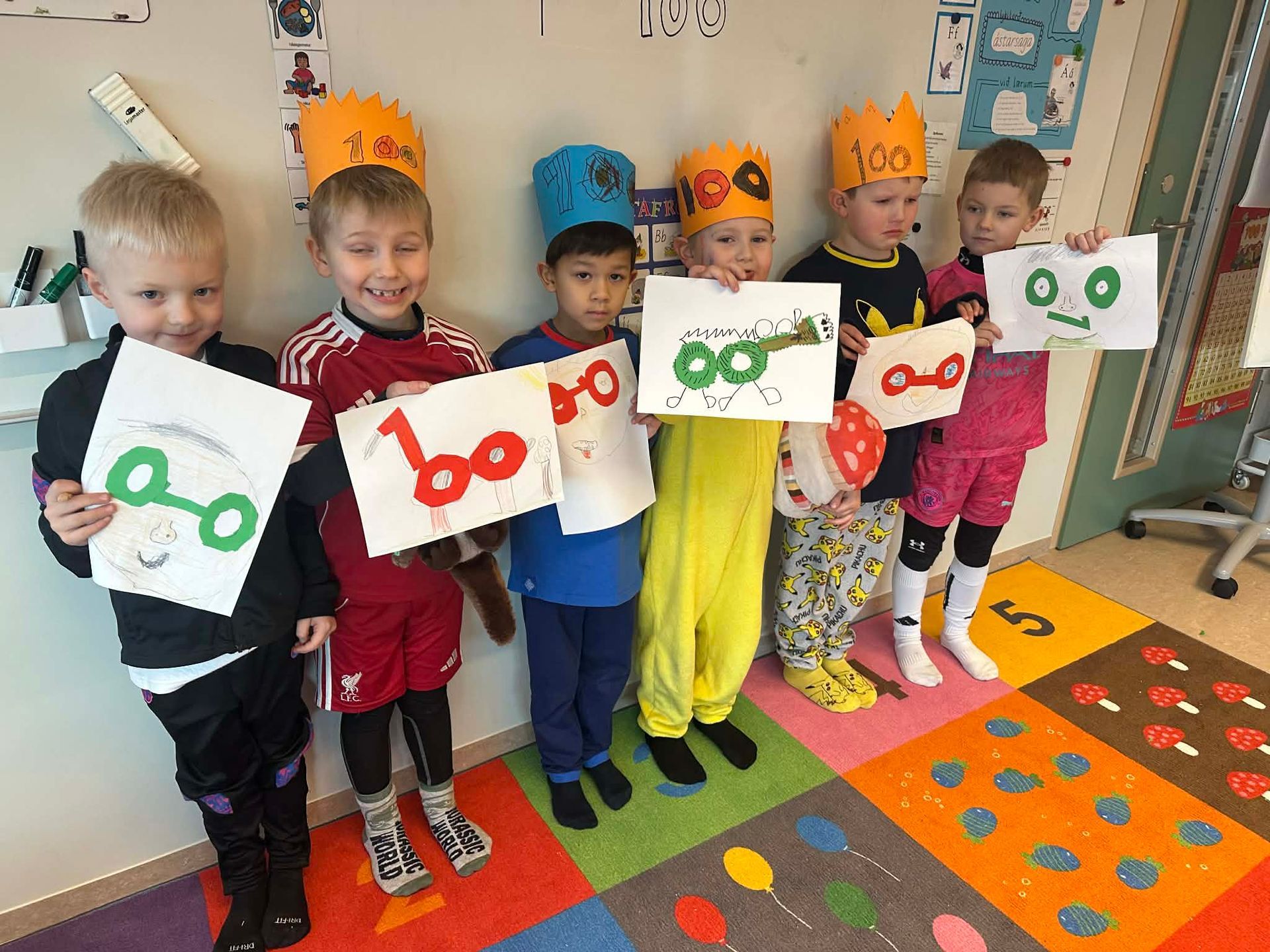 Á sjálfann hátíðsdaginn mættu allir í nátt-/kósýfötum og með lúrudýrin sín, bjuggu til kórónur og unnu á ýmsum stöðvum með töluna 100.