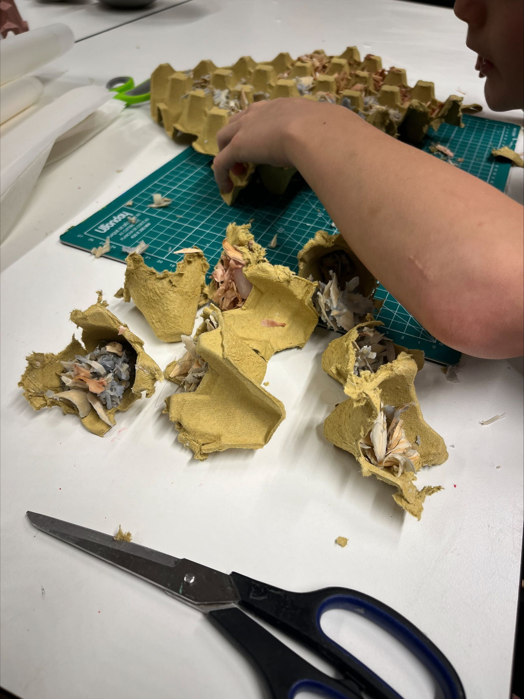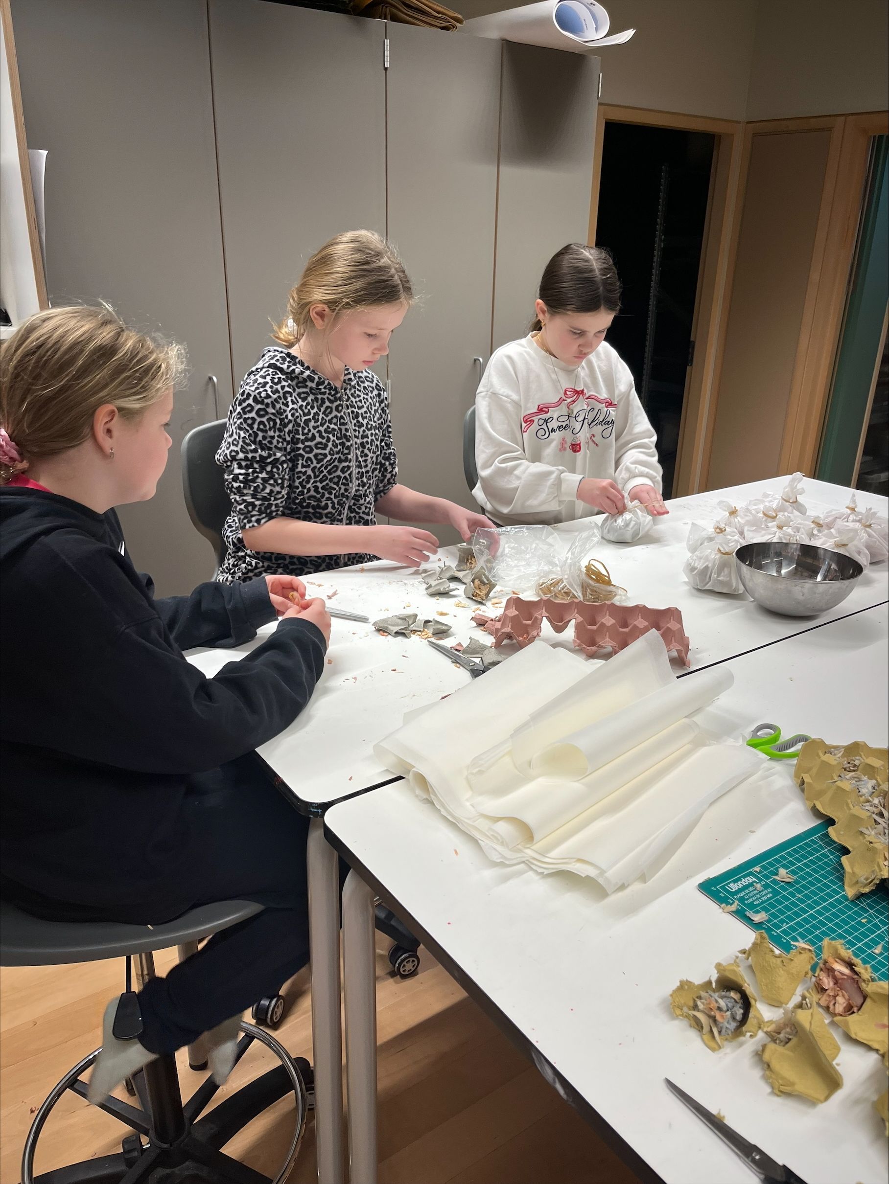 5. bekkur endurvinnur kertaafganga, hefilspæni og eggjabakka í smiðju. Úr verða uppkveikikubbar fyrir arna.