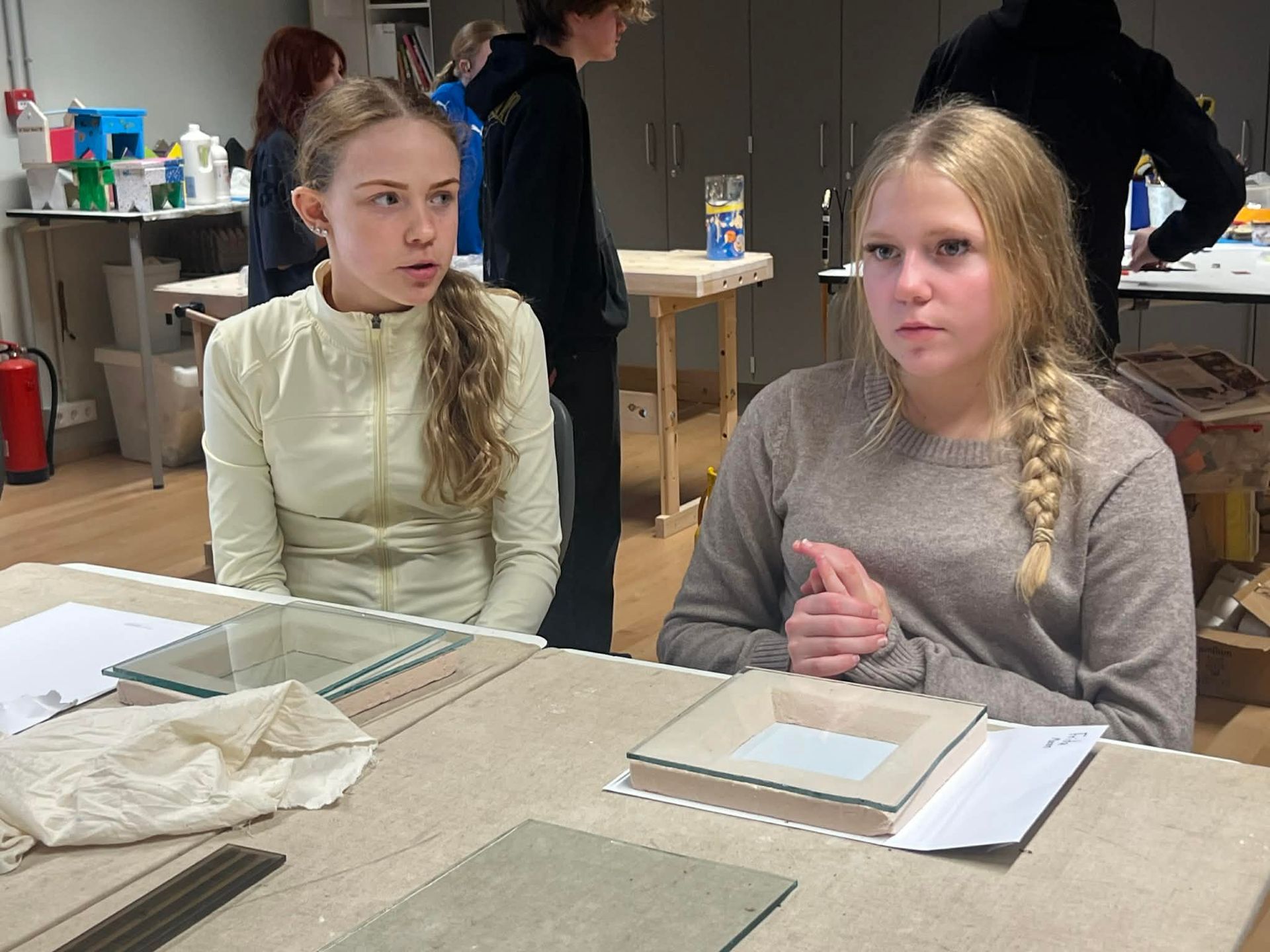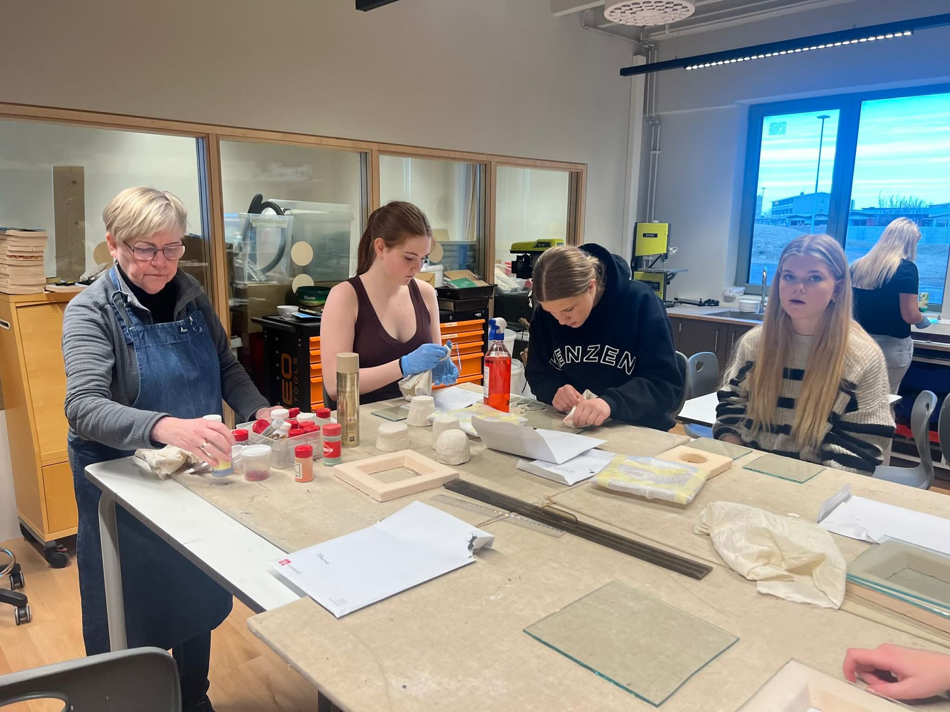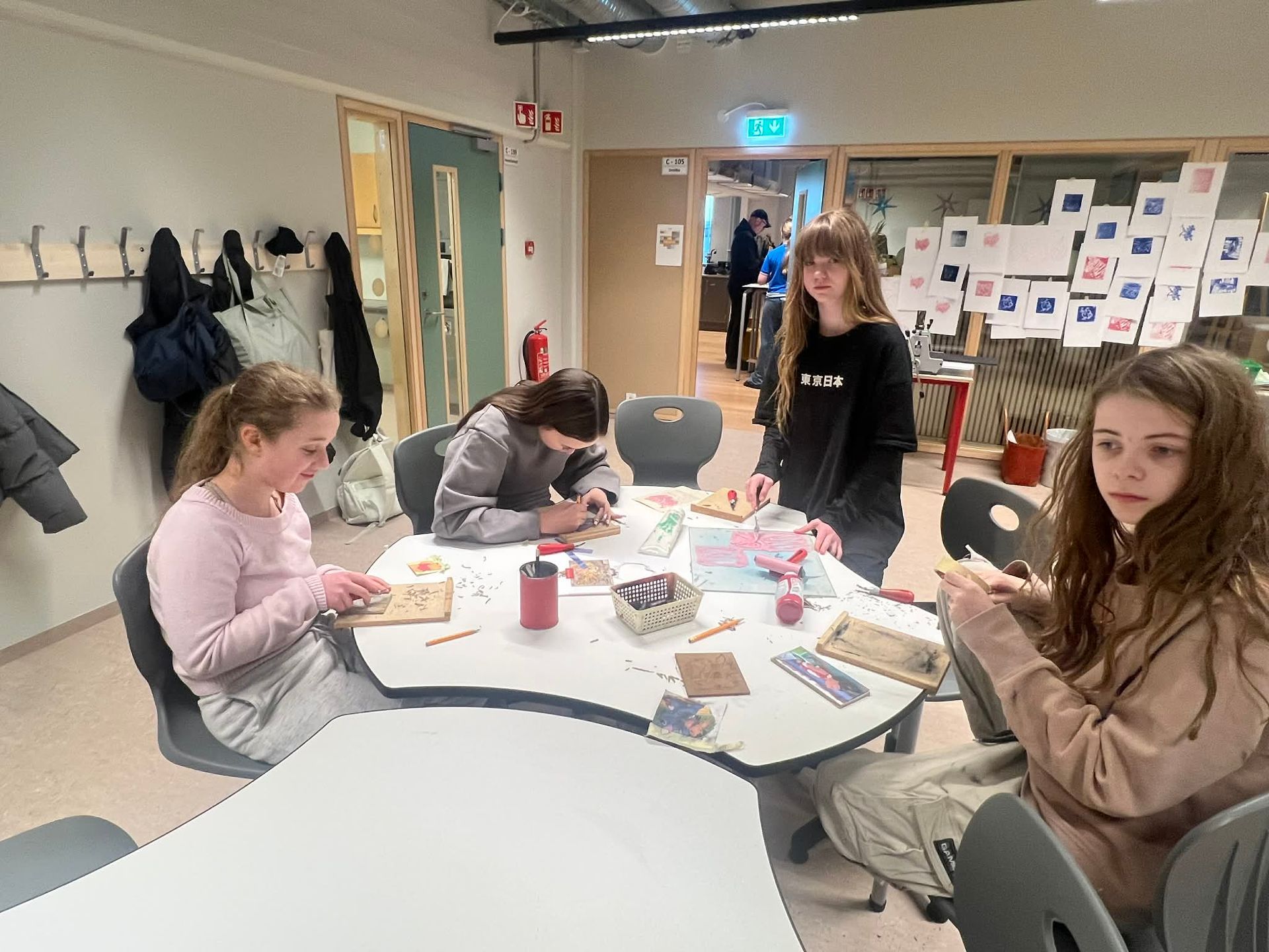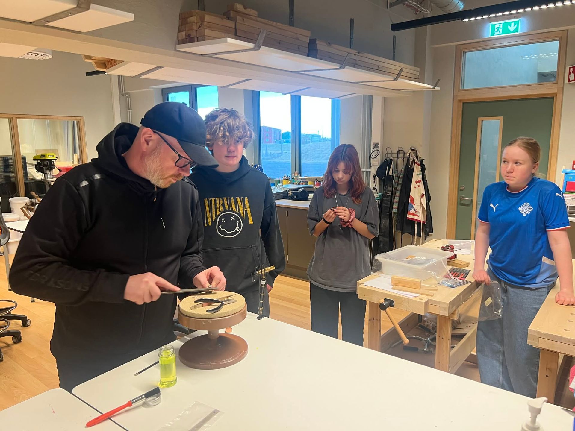 Meðfylgjandi myndir voru teknar í smiðjunni fimmtudaginn 27.nóvember en þá var í gangi örnámskeið sem er fyrir 8-10.bekk en í þessum eina tíma var verið að vinna með ólík viðfangsefni, nægir þar að nefna gler, málm og dúkristu og fleira.