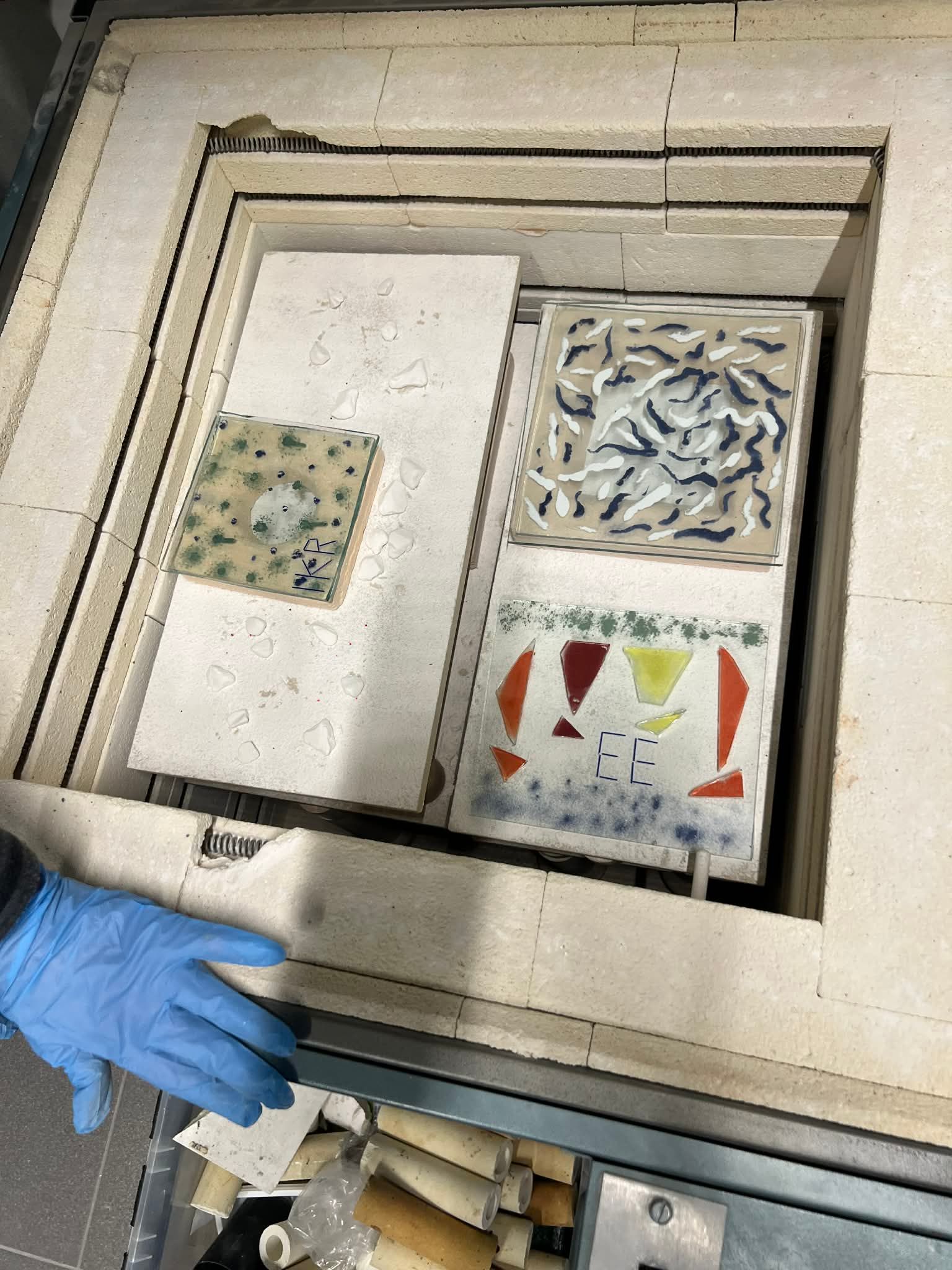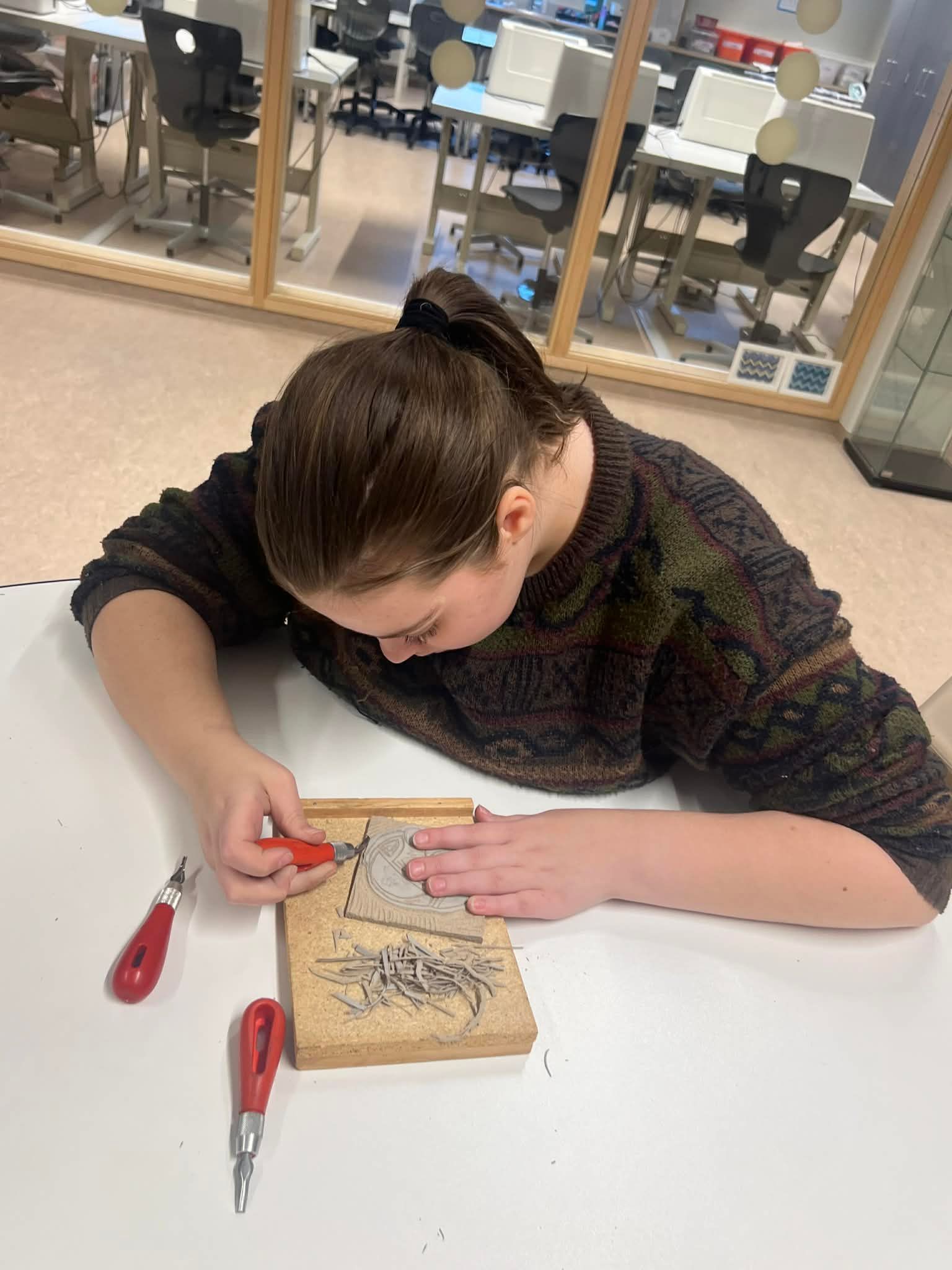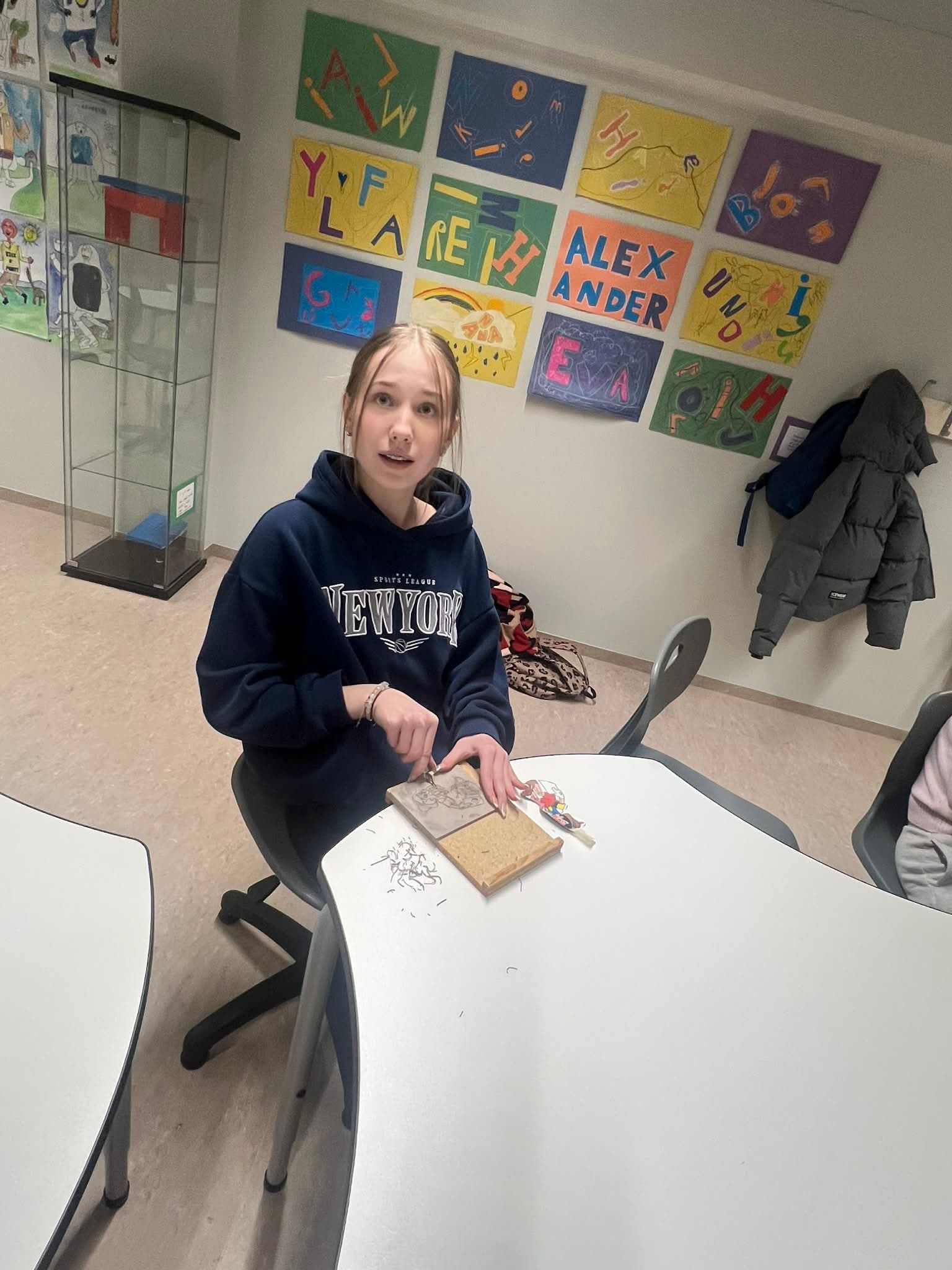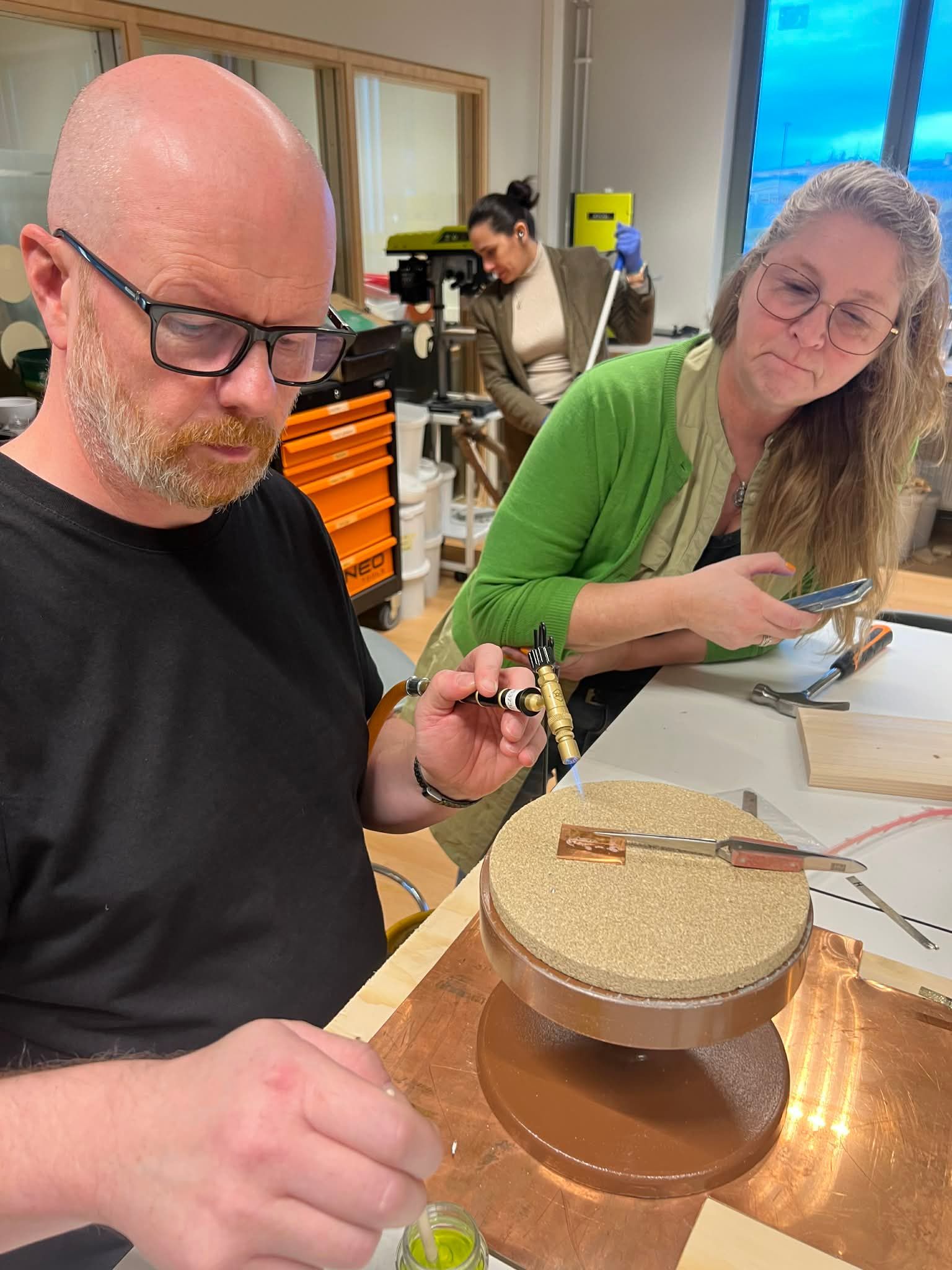 Meðfylgjandi myndir voru teknar í smiðjunni fimmtudaginn 27.nóvember en þá var í gangi örnámskeið sem er fyrir 8-10.bekk en í þessum eina tíma var verið að vinna með ólík viðfangsefni, nægir þar að nefna gler, málm og dúkristu og fleira.