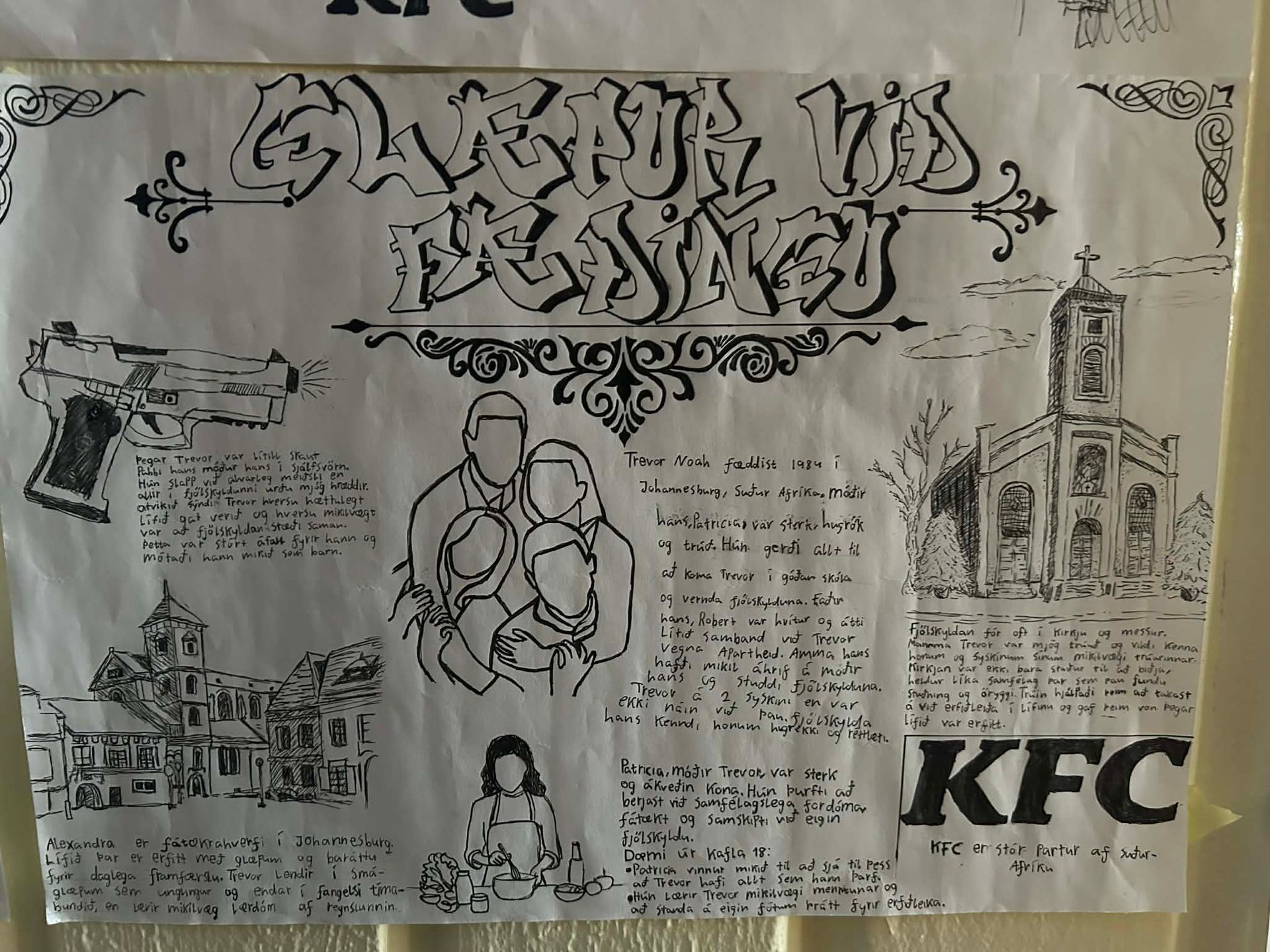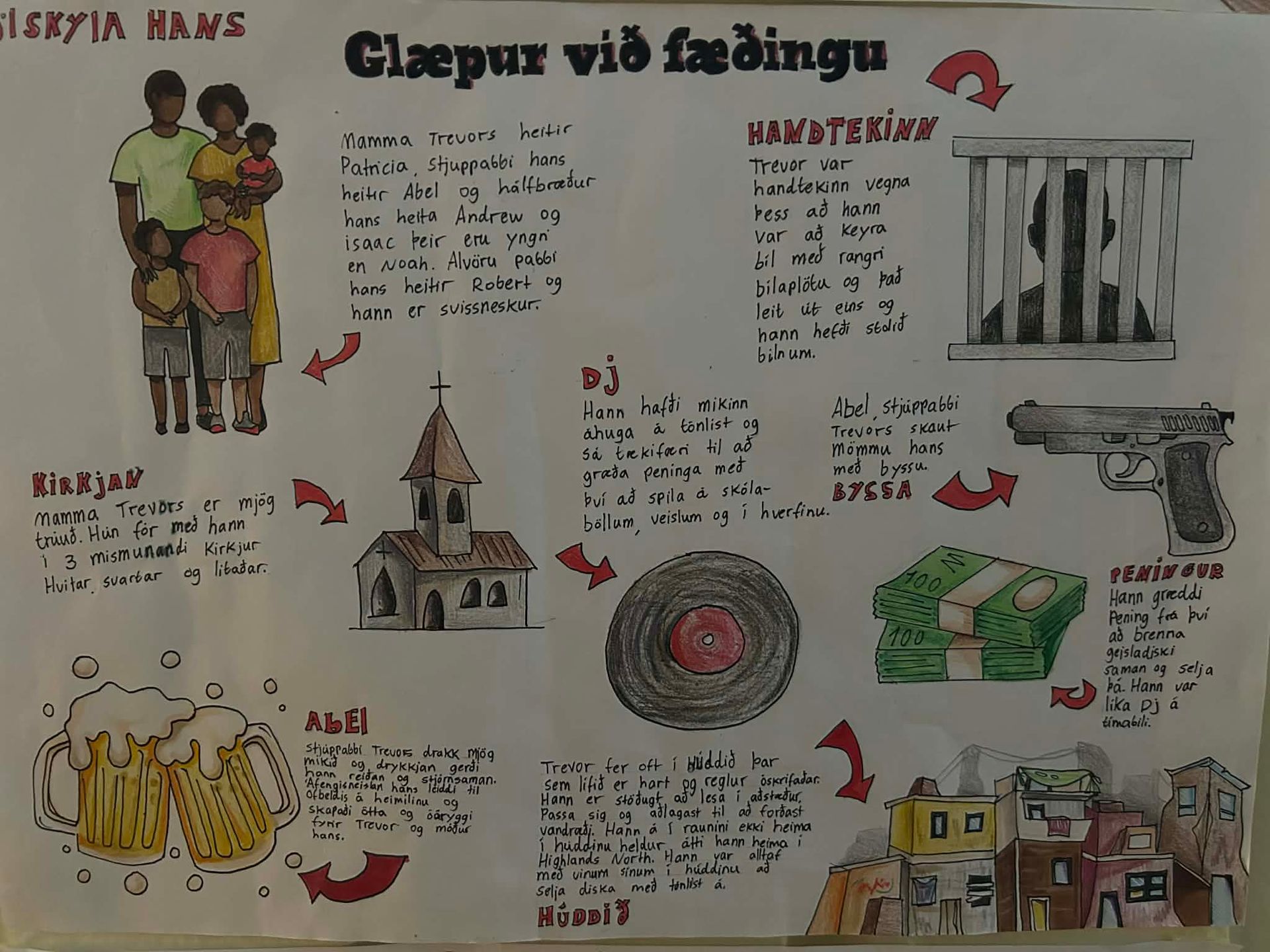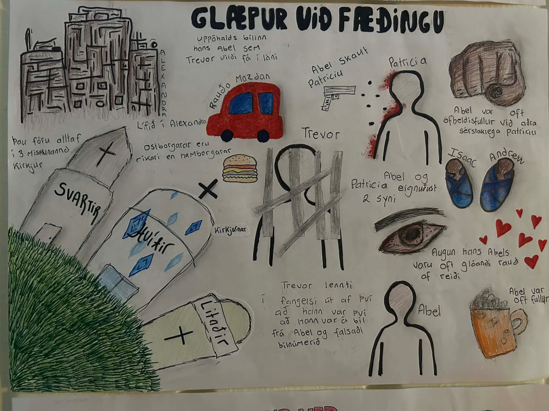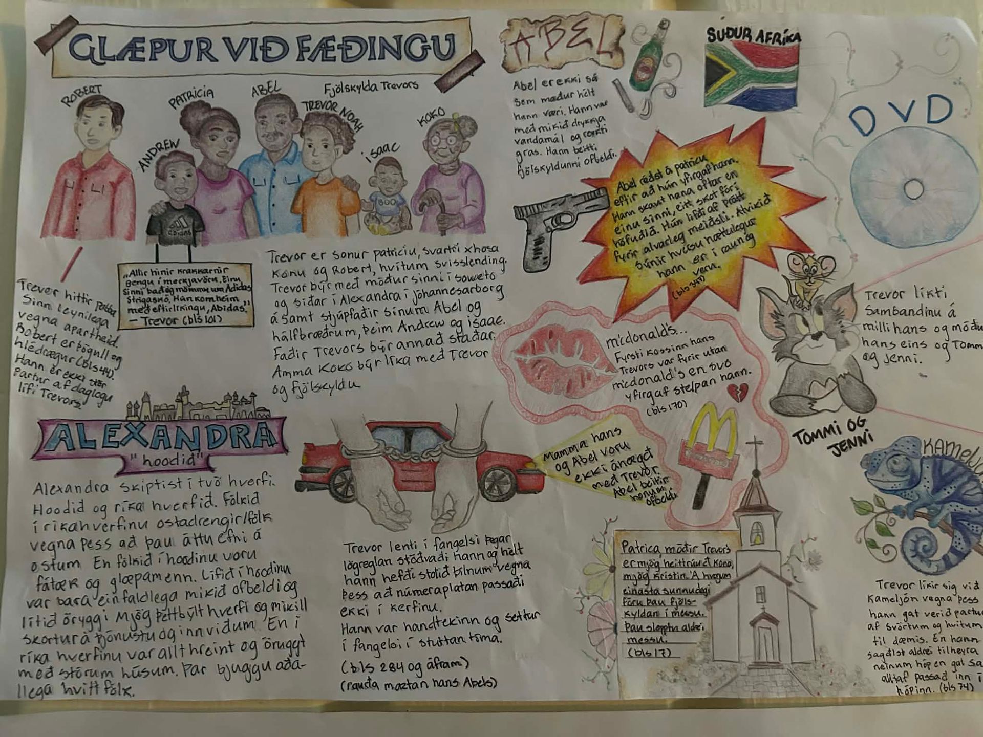 Við ákváðum að fara nýja leið til að efla skilning nemenda okkar á bókmenntum. Nemendur gerðu glósumynd úr bókinni. Glósumynd er skapandi ferli þar sem nemendur skrá niður upplýsingar og sýna fram á skilning á bókinni með því að teikna myndir, tákn og skrifa stutta texta.