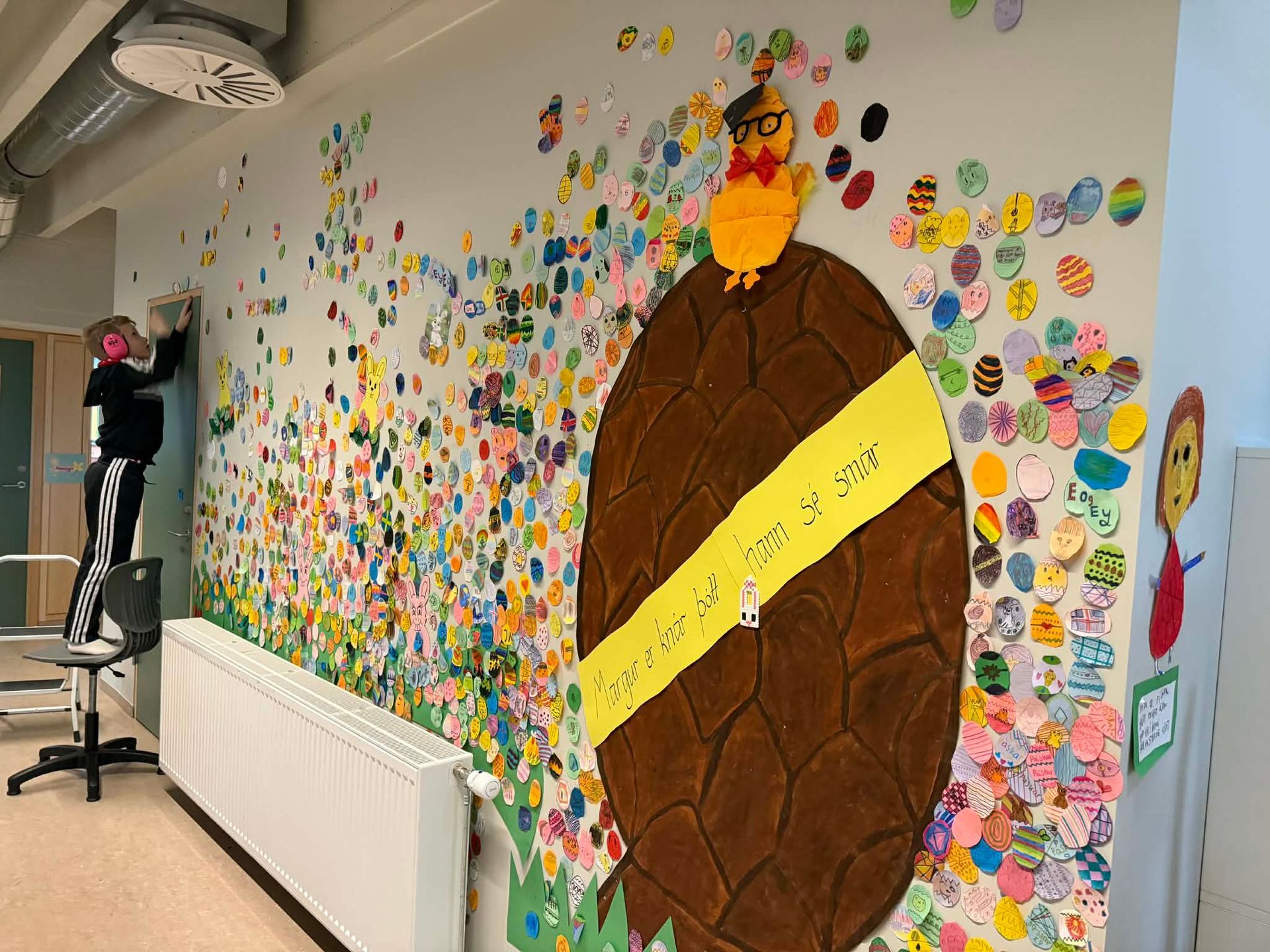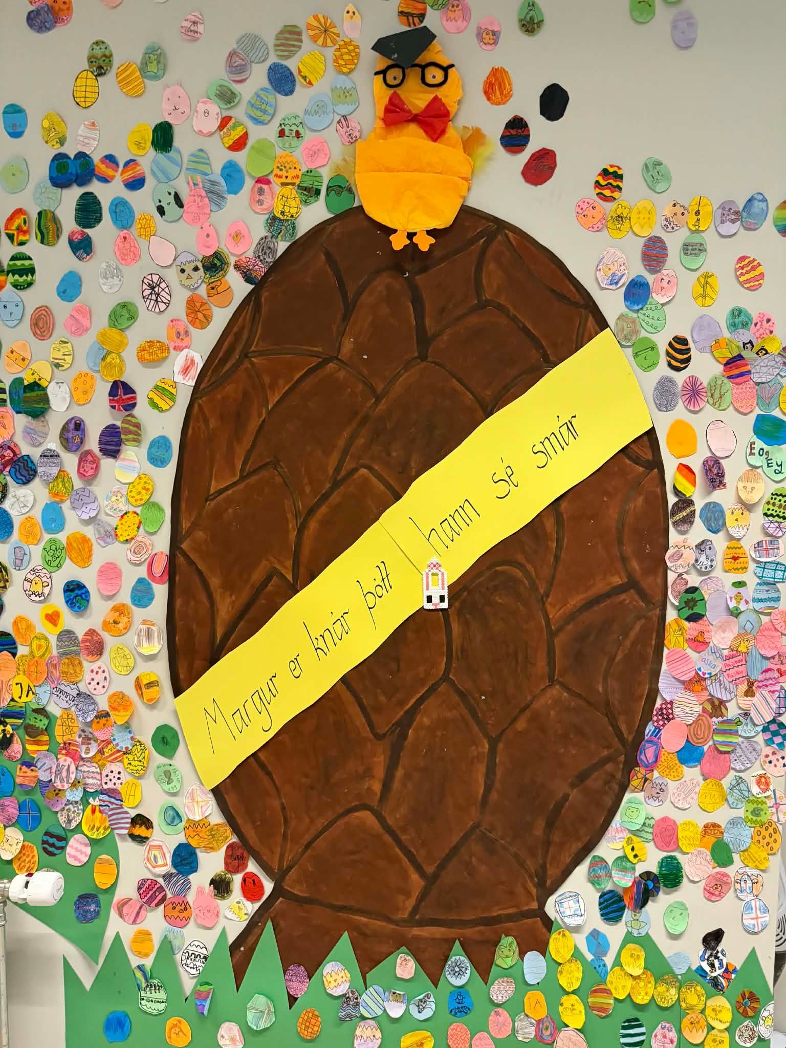 Fyrir hverjar 20 mínútur í lestri bjuggu nemendur til lítið páskaegg sem þeir hengdu upp á vegg. Smám saman fylltist veggurinn af litríkum eggjum og er hann nú orðinn einstaklega páskalegur og líflegur 🥚🎨🌼