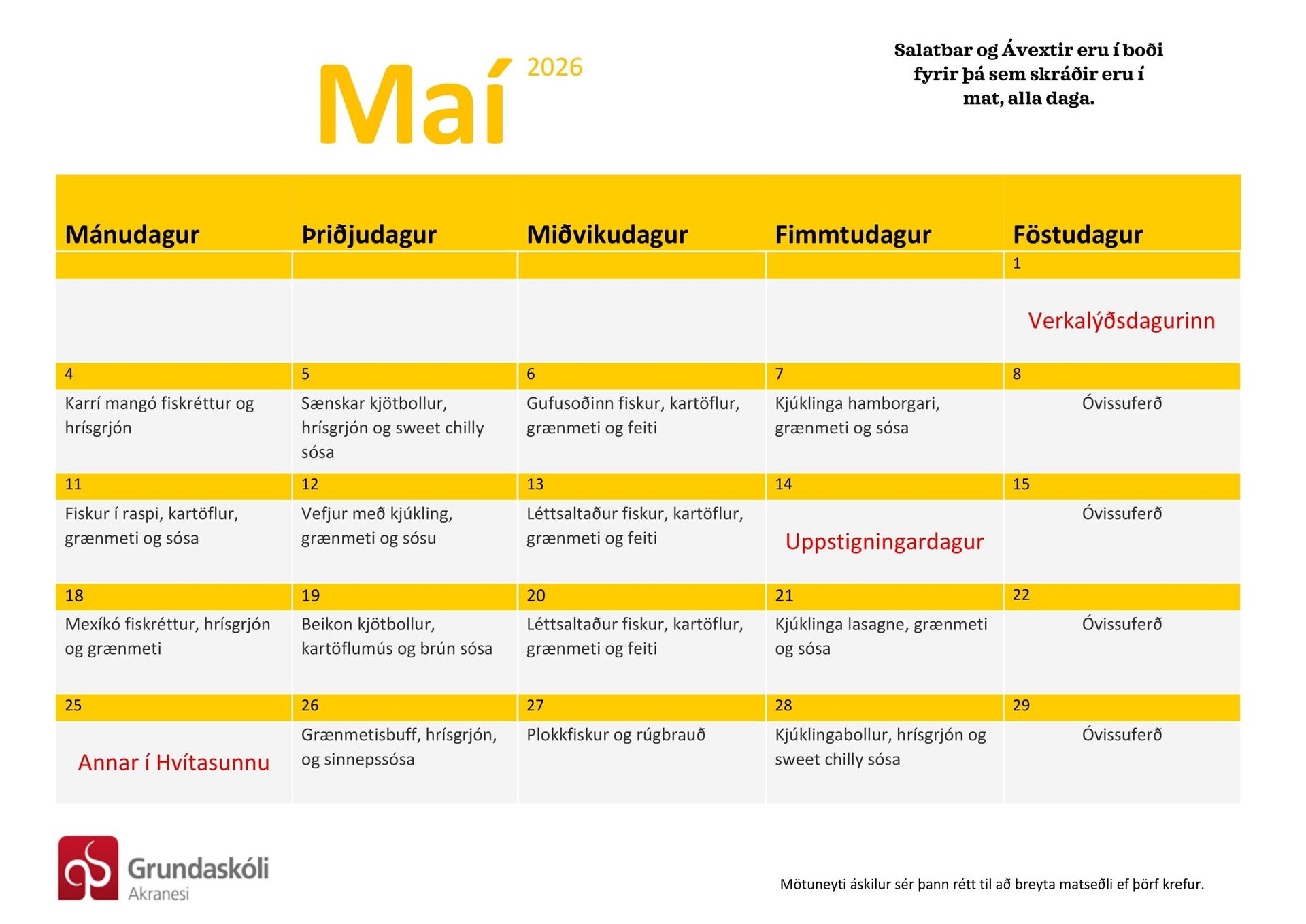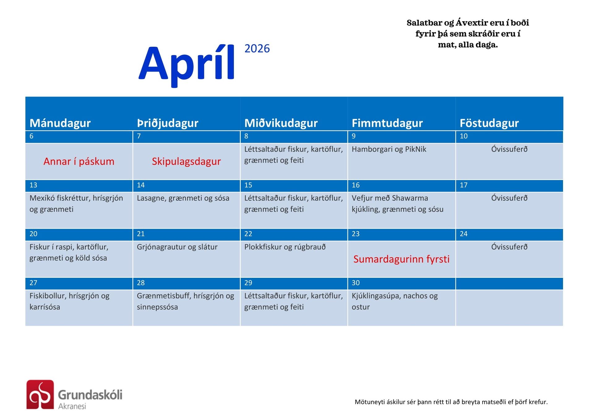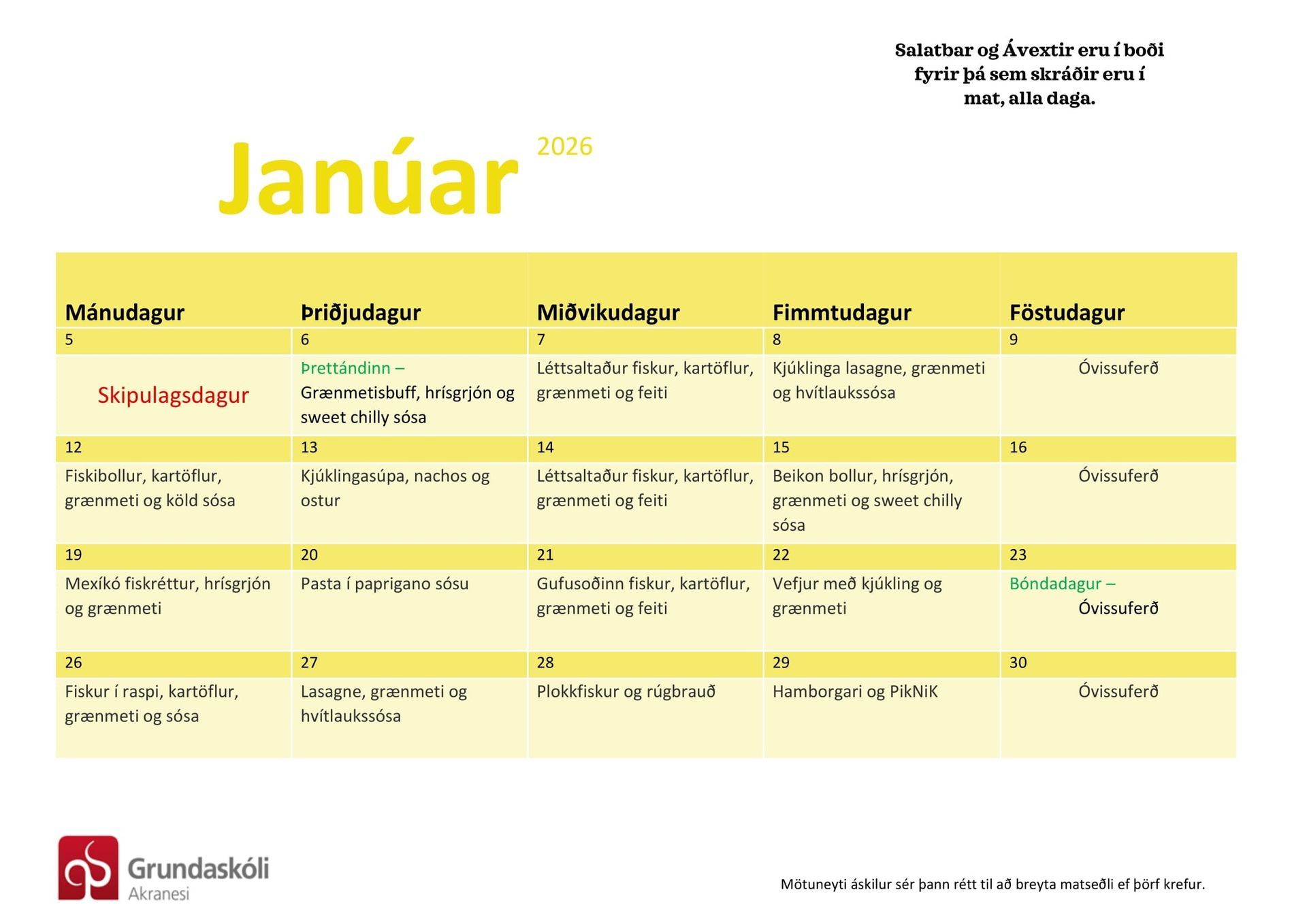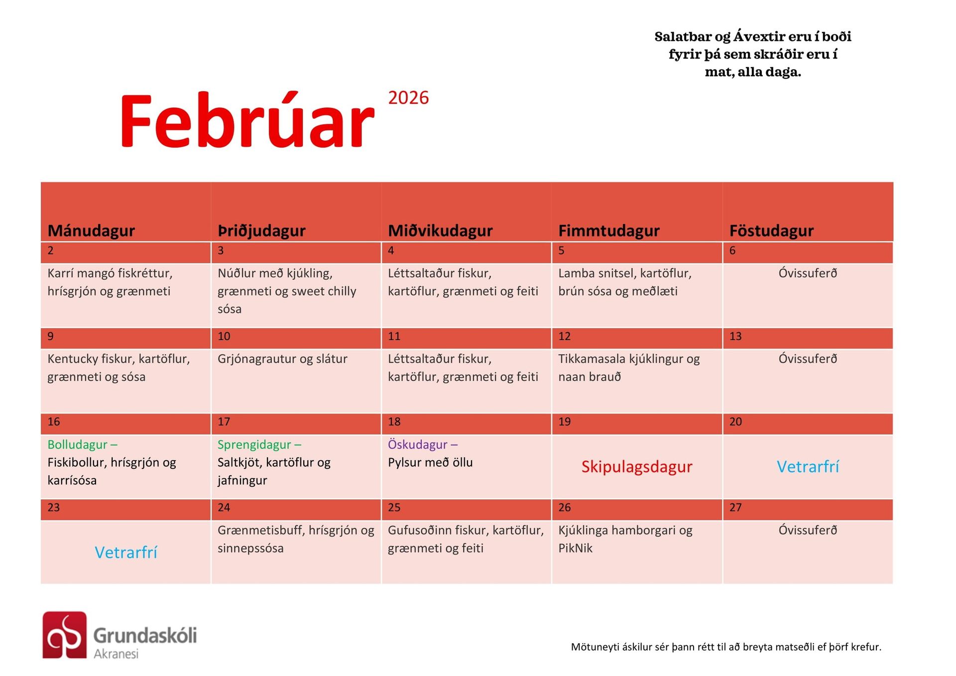 1. – 4.bekk þurfa ekki að skrá börnin sín í mat, heldur eru þau með fasta skráningu í mat alla daga.