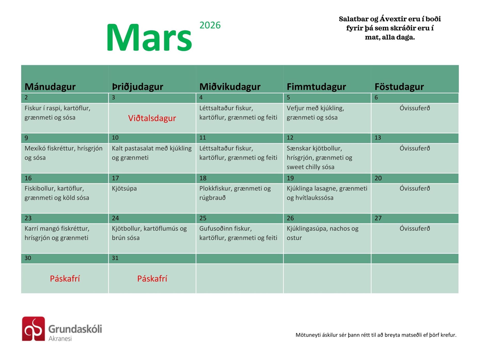 Foreldrar fá sendan tölvupóst með afriti af matarskráningunni þegar búið er að senda inn og er hver dagur skýr með hvað er í boði í matinn.