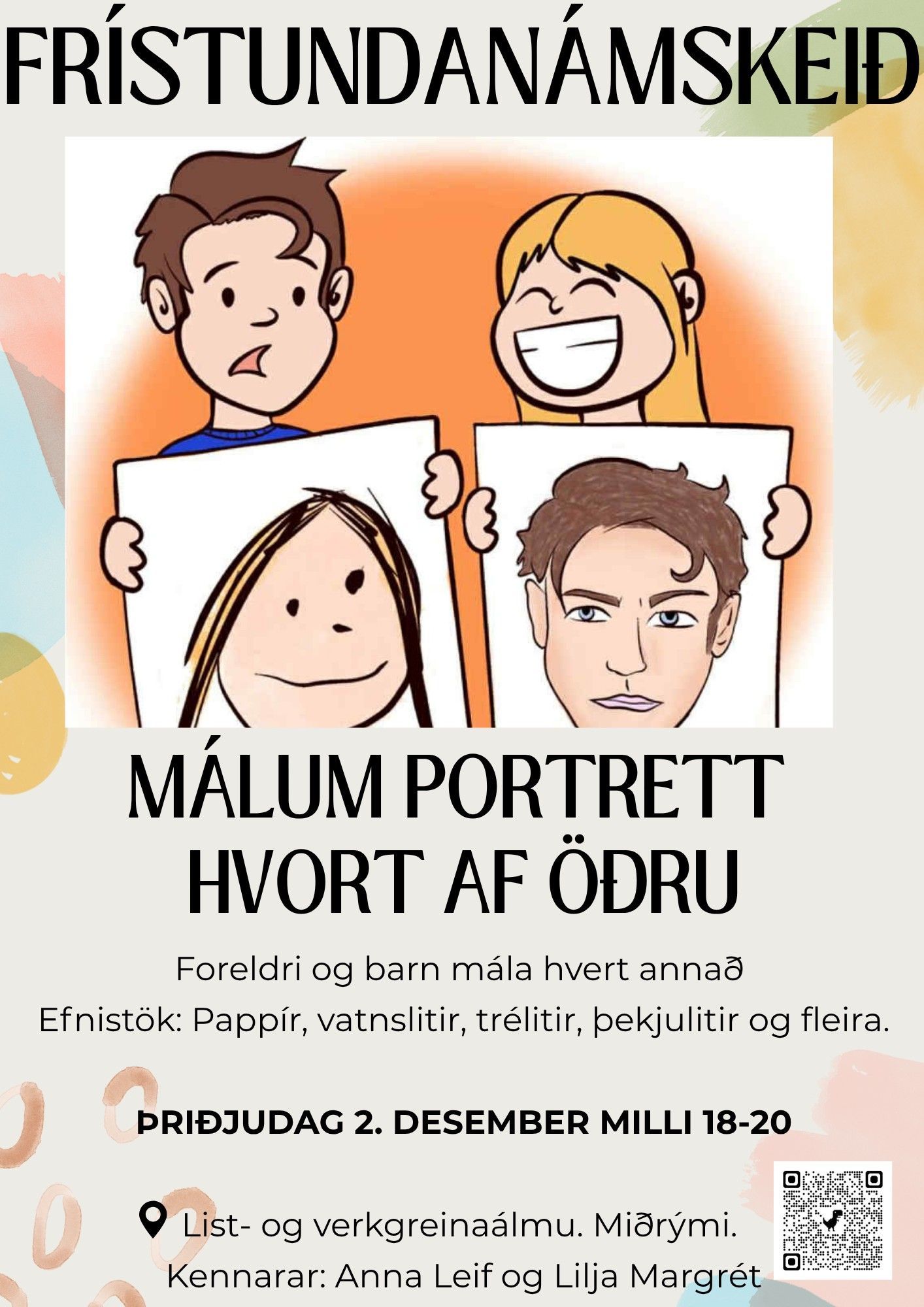 Listasmiðja þar sem foreldrar og börn vinna saman að því að mála hvort annað. Boðið verður uppá ólíkan efnivið t.d. akrýlmálningu, vatnslitamálningu, tréliti og blýanta.