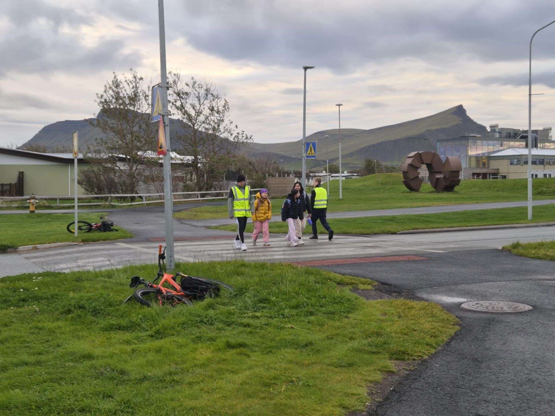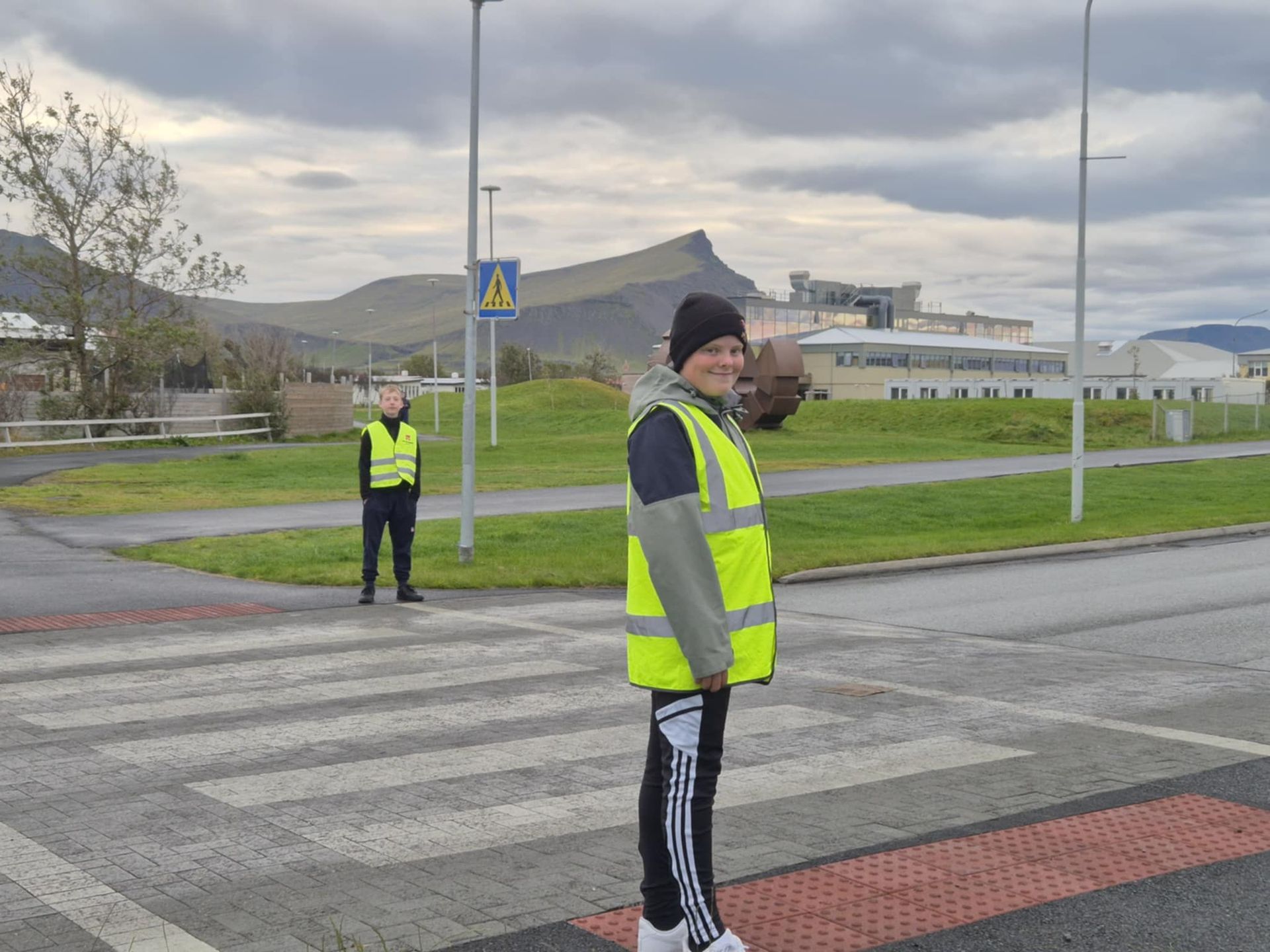 Það voru morgunhressir 9. bekkingar sem mættu galvaskir í gangbrautavörslu í morgun. Það er árgangur 2011 sem tekur nú við keflinu og sinnir þessu mikilvæga starfi í vetur.