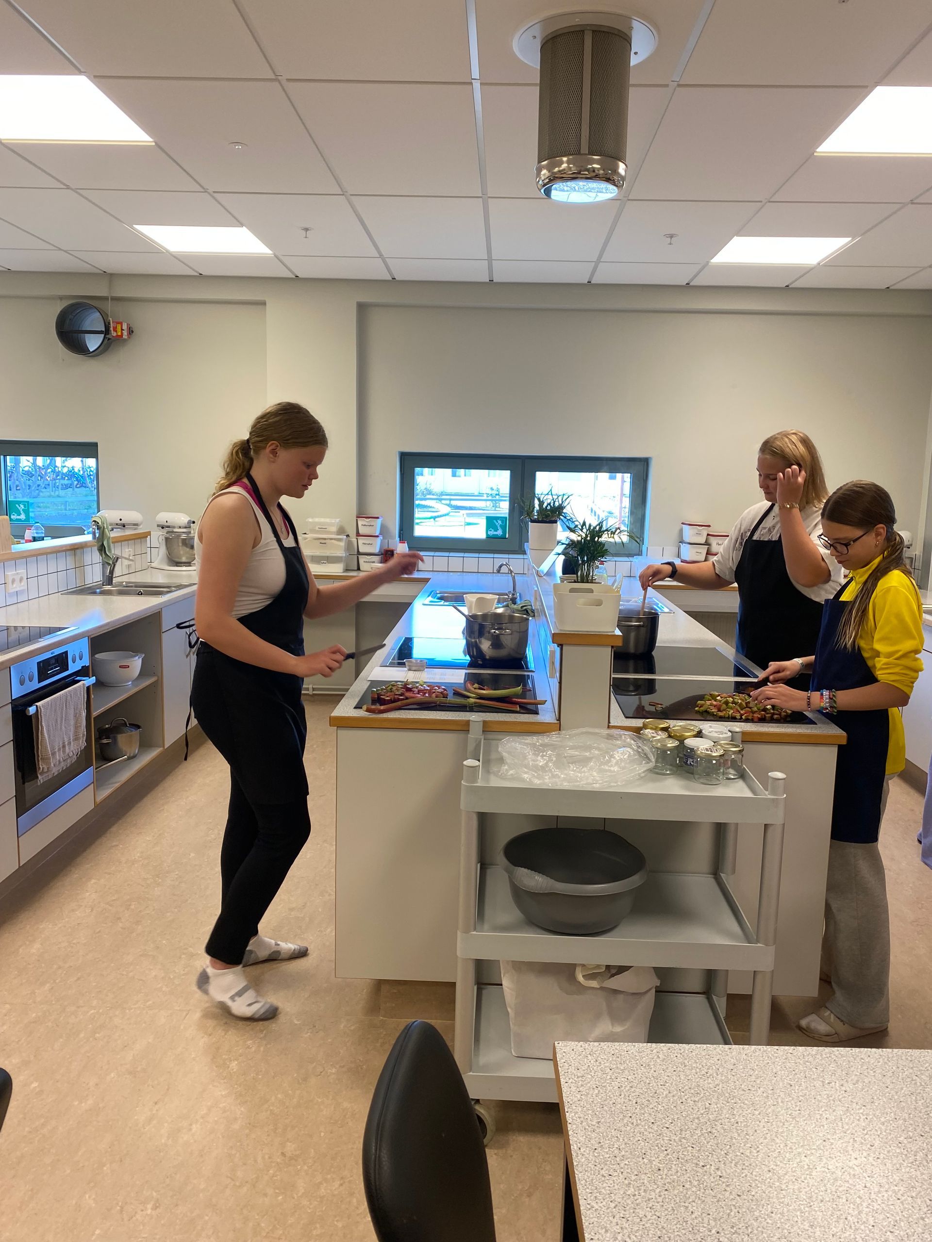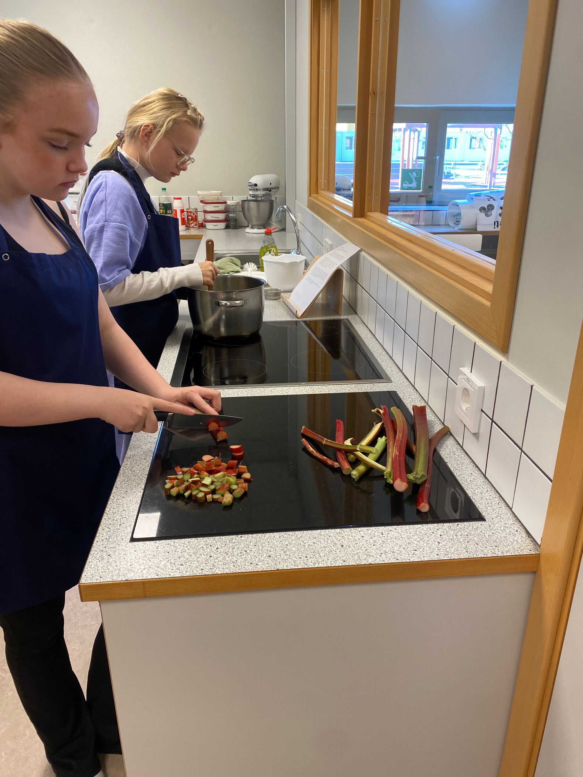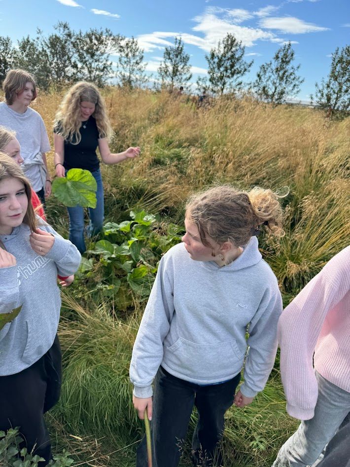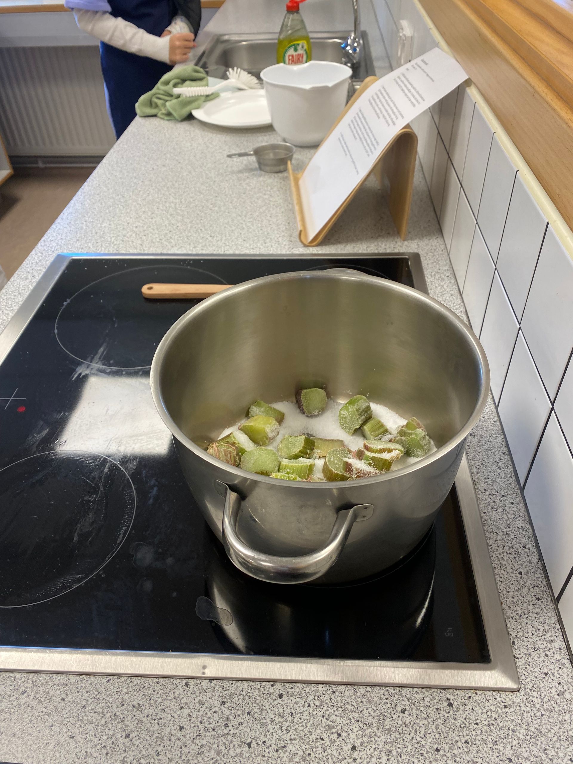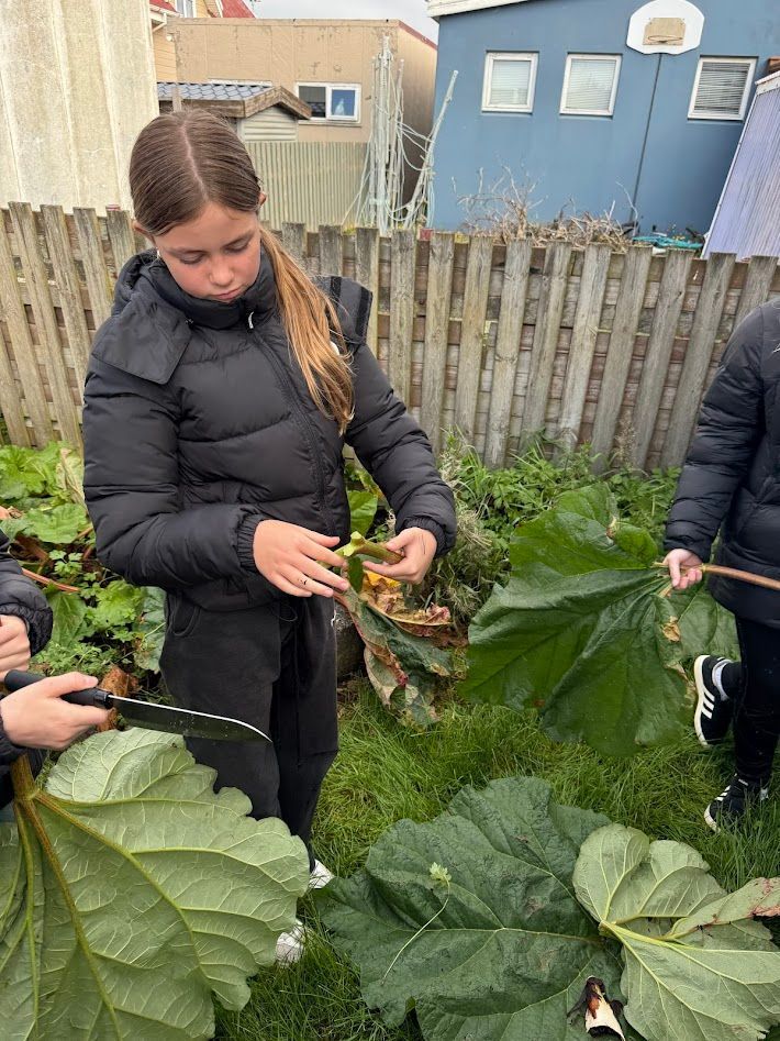 Í náttúrufræðitíma fóru nemendur út og tíndu ferskan rabarbara í nærumhverfinu. Í framhaldinu nýttu þau afraksturinn í heimilisfræðistofunni þar sem þau elduðu ljúffenga rabarbarasultu og bökuðu girnilega rúllutertu.