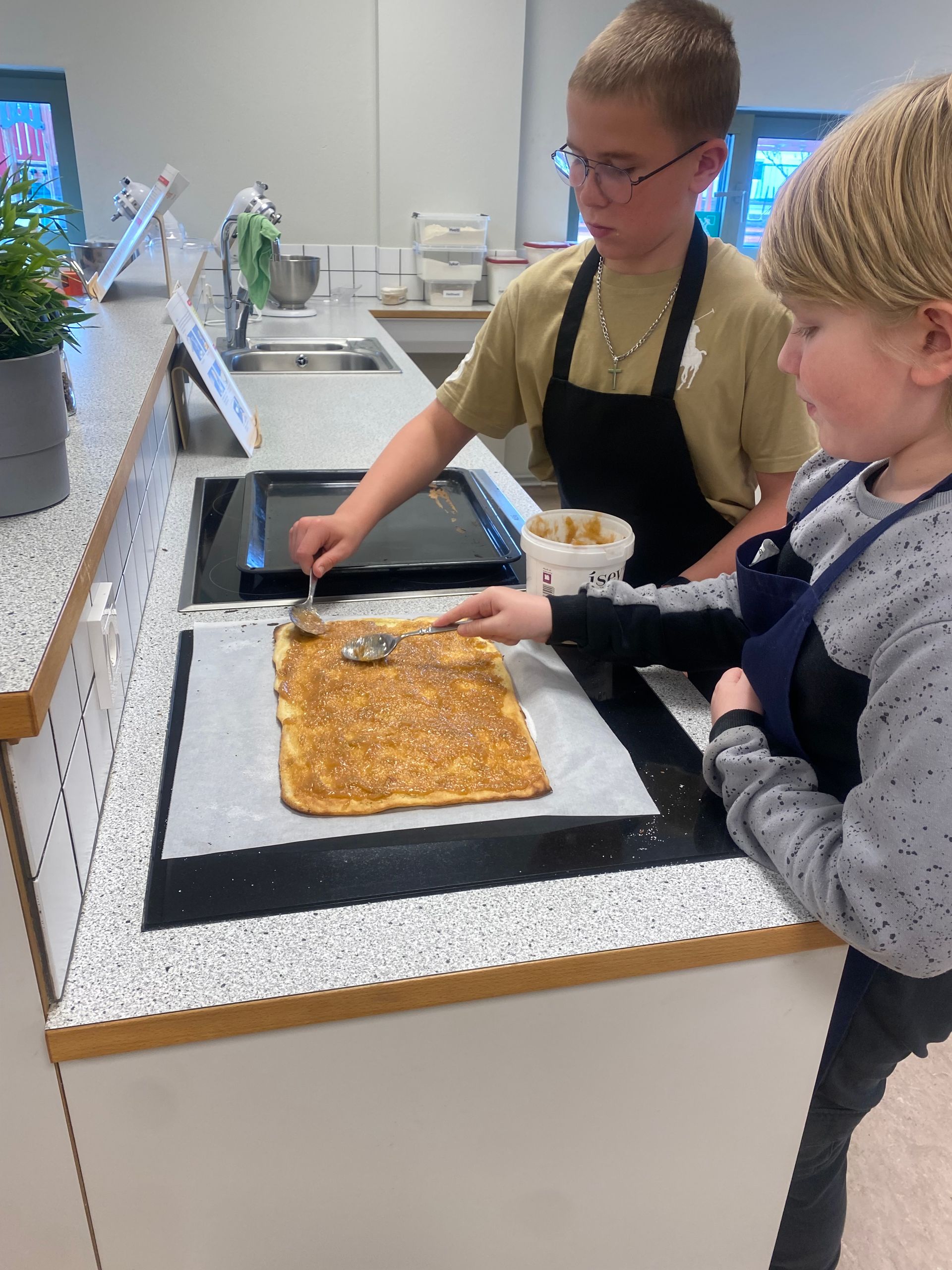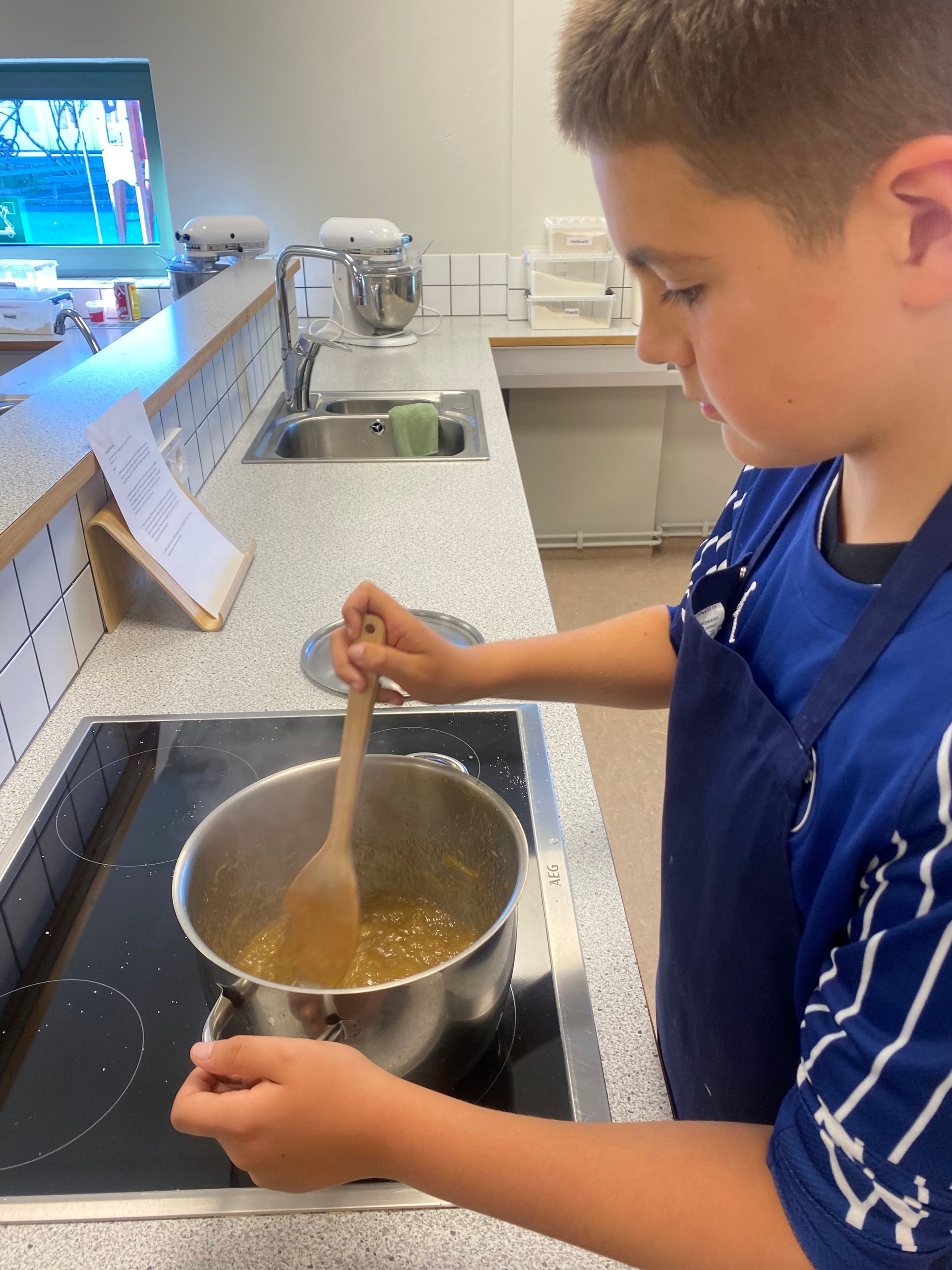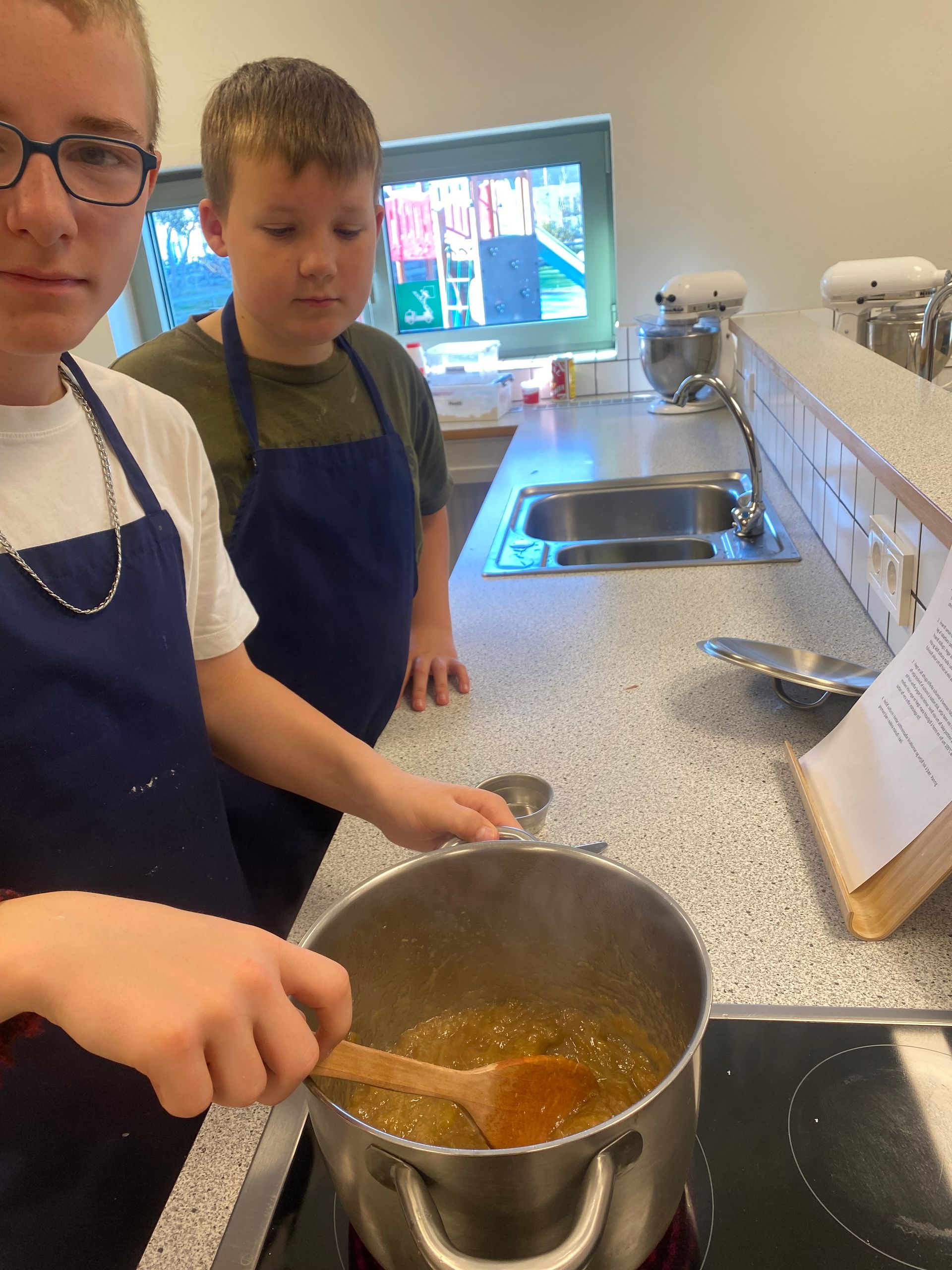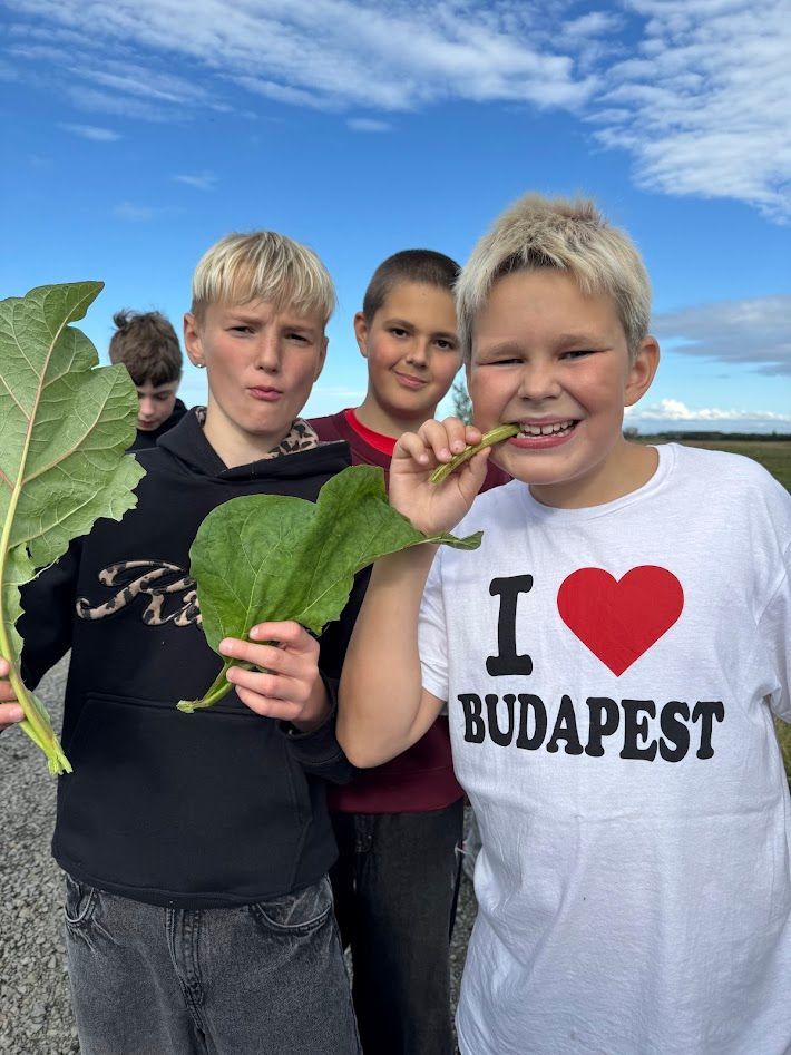 Í náttúrufræðitíma fóru nemendur út og tíndu ferskan rabarbara í nærumhverfinu. Í framhaldinu nýttu þau afraksturinn í heimilisfræðistofunni þar sem þau elduðu ljúffenga rabarbarasultu og bökuðu girnilega rúllutertu.